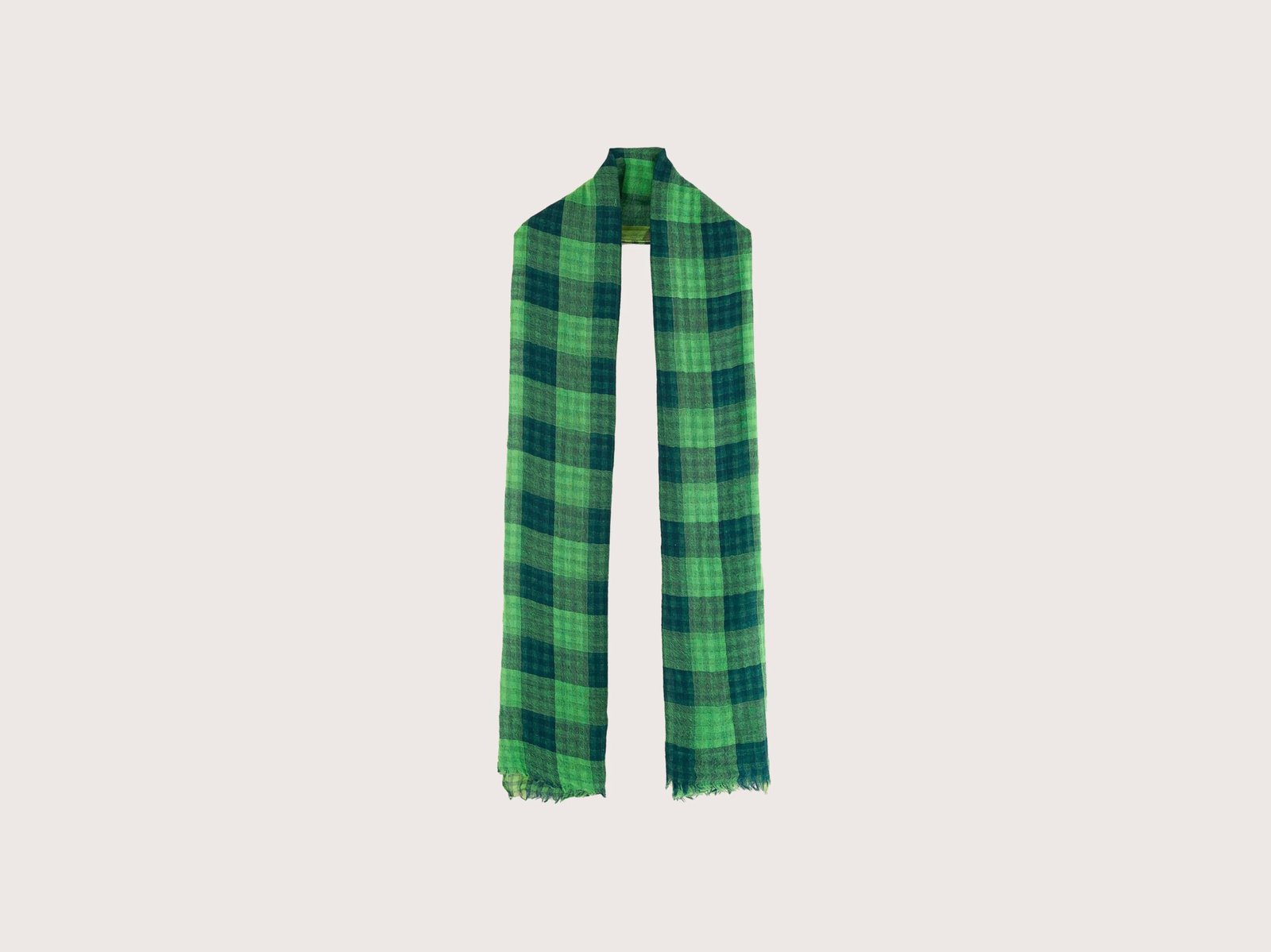 Wooven scarf made from double weaved wool with ecru and khaki checks in two sizes. One side with big checks. the other with small ones. creating a vibrant effect.